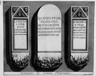 | Keywords: Piranesi-2055.jpg 2 2054 2056 LIV fr <br> à gauche L ucius Lucilius / L uci f ilius Pub lilia / Rufus / Verona mil es / coh ortis V pr aetoriae militav it / ann os VIIII vix it ann os XXIIX CIL 06 2580 ; au centre Q uintus Cassius P ubli f ilius Gal eria / Valens Pisis / milit avit in coh orte IIII pr aetoria / ann os XVIII evocatus an nos II / vix it ann os XXXX hic situs est / monumentus hic est 06 2530 ; à droite M arcus Propetius / M arci f ilius Rom ilia / Firmus Ateste / mil es coh ortis V pr aetoriae / militavit ann os XVI / vix it ann os XXXVI / i n f ronte p edes V i n a gro p edes II44 06 2585 Ancient Roman inscriptions in Rome CIL VI 002580 CIL VI 002530 CIL VI 002585 |