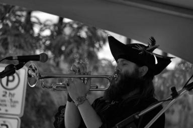 Keywords: blackandwhite black white bw monochrome street streetphotography downtown canada britishcolumbia bc okanagan kelowna pirate trumpet musician summer blockparty music man male guy person playing costume hat beard
