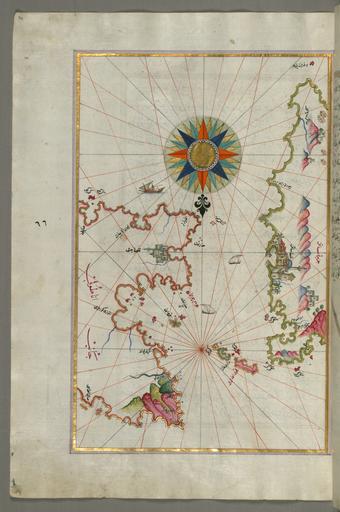 | Keywords: Piri Reis - Map of Chios Island Facing Kysos Fortress on the Anatolian Side - Walters W65870A - Full Page.jpg  Piri Reis - Map of the Anatolian Coast Around the Bay of Izmir - Walters W65868B - Full Page jpg Piri Reis - Detailed Map of Sakiz Island with its Fortress and Other Topographical Features - Walters W65873A - Full Page jpg rtl This folio from Walters manuscript W 658 contains a map of Chios Sakiz Saqiz Island facing Kysos Çesme Fortress on the Anatolian side late 11th century AH/AD 17th century-early 12th century AH/AD 18th century Ottoman ink and pigments on laid European paper cm 34 24 accession number W 658 70A 79721 Ahmad Afandi date and mode of acquisition unknown see folio 4a Ali Afandi date and mode of acquisiton unknown see folio 4a Sayyid Ali Qapudan date and mode of acquisition unknown see folio 1a Sultan Mahmud Khan date and mode of acquistion unknown waqf seal and followed by a bequest statement now erased and the seal of the inspector of wakfs Mustafá Tahir see folio 4a Henry Walters Baltimore date and mode of acquisition unknown Walters Art Museum Henry Walters Acquired by Henry Walters place of origin Turkey Walters Art Museum license 2D Piri Reis Kitab-ı Bahriye Walters MS 658 070A Media contributed by the Walters Art Museum needs category review Anatolian Coasts by Piri Reis in the Walters Art Museum |