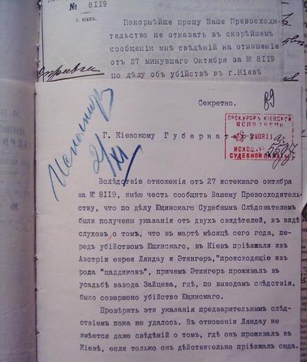 | Keywords: Pismo Chaplinskogo Girsu1.jpg Дело об убийстве Ющинского Письмо П оку о а Киевской Судебной Палаты Г Г Чаплинского Киевскому Губе нато у А Ги су от 2 11 1911 о цадиках Ландау и Этинге е File about murder of Jushchinsky The letter of the Public prosecutor of the Kiev Court Chamber G G Chaplinsky to the Kiev Governor A Girs from 2 11 1911 about tsadiks Landau and Etinger http //www russia-talk org/cd-history/Beilis/440401 htm 1911 G Chaplinsky PD old PD-old Beilis Affair | ||||
