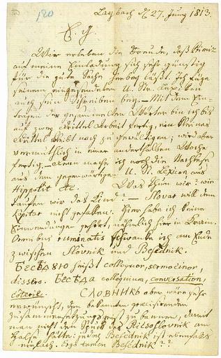 | Keywords: Pismo Valentina Vodnika Žigi Zoisu; Ljubljana, 27. 6. 1813 (1).jpg Ljubljana 27 junija 1813 Vaša milost Zelo smo veseli da se je Primic na moje povabilo za dobro stvar zelo ugodno odzval Spodnještajerskemu leksikonu ki ga je poslal prilagam tudi njegovo pismo Z vnašanjem zbranih besed sem gotov do dveh tretjin Za obdelavo ostaja še ena tretjina ki pa bo verjetno končana v poldrugem tednu Potem bom še preveril po najnovejšem U St leksikonu po Hipolitu itd Kaj bomo storili Kako bomo krstili otroka Slovar Kopitarju menda ni všeč Tu namreč na Kranjskem pa nisem slišal nobenih ugovorov Omnibus ruminatis omahujem na koncu med Slòvnik in Beſèdnik Бєсέдую pomeni colloquor sermocinor dissero Бєсέда colloquium <u>conversation </u> <u>côterie</u> <u> </u> СЛОВ ИΚЬ pa bi bil zelo priporočljiv da bi se izognili znani grecizirajoči ljubezni do zloženk Tako nam za vrat ne bi sedla mora Ricsoſlovnika; toda Beſèdnik je prav tako preprost Ergo tamen Beſèdnik Laybach den 27 Juny 1813 E G Wir erleben die Freude daß Primiz auf meine Einladung sich sehr günstig für die gute Sache herbey läßt Ich füge seinem eingesendeten U St Lexikon auch sein Schreiben bei Mit dem Eintragen der gesammelten Wörter bin ich bis auf zwey drittel Arbeit fertig ein kleines drittel bleibt noch zu gewältigen; wird aber vermuthlich in einer anderthalben Woche fertig Dann mache ich noch die Nachlese aus dem gegenwärtigen U St Lexicon aus Hippolit etc Was thun wir wie taufen wir das Kind Slovar will den Kopitar nicht gefallen Hier habe ich keine Einwendungen gehört nähmlich hier in Krain Omnibus ruminatis schwanke ich am Ende zwischen Slòvnik und Beſèdnik БєсЪдǒю heißt colloquor sermocinor dissero БєсЪда colloquium <u>conversation</u> <u>côterie </u> СЛОВ ИΚЬ aber wäre sehr erwünscht den bekanten graecisirenden Zußammensetzungs Geist zu bannen damit man nicht den Spuck des Ricsoſlovnik am Halse hätte jedoch Beſèdnik ist ebenfalls einfach Ergo tamen Beſèdnik http //nl ijs si/e-zrc/zois/html/MP57 html 1813-06-27 creator Valentin Vodnik PD-old-100 <gallery> Pismo Valentina Vodnika Žigi Zoisu; Ljubljana 27 6 1813 2 jpg part 2 </gallery> 1813 letters Letters by Valentin Vodnik Letters to Sigmund Zois |