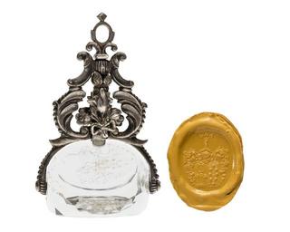 | Keywords: Pitschaft av silver och bergskristall med graverad vapensköld, 1700-tal - Hallwylska museet - 110334.tif LSH artwork sv Prisma av bergskristall tresidig med ovala sidor samt fasetterade ändar och kanter På en av sidorna graverat ett vapen avtryck se Planschverket på fyrsidig sköld med hjälmprydnad och lövverk Skaft platt triangulärt genombrutet och ciselerat nedtill en halvcirkelformig båge på vars utsida vid vardera ändan en uppåt doserande pärlstav däröver ett bladliknande utsprång; prismat rörligt i bågen på en tapp i vardera ändan Från bågen utgå två mot varandra snett uppresta S-formade sidostycken vartdera av två bågar den nedre större i form av ett akantusblad på ytterkanten med en pärlstav den övre mindre med inrullade ändar Mellan sidostyckena nedtill på en lång slät tapp en skjutbar hylsa med fjäder på vardera av hylsans sidor en pålagd blombukett ombunden med ett band knutet i en rosett med två öglor nedtill en slät klyka vilken griper över prismats uppåtvända kant; upptill en fyrbladigt blomkalk över denna en refflad knopp överst mellan två frånvända bågar en konturerad ögla med fasetterad knopp Etui original klätt med brunt kalvskinn varpå rika blom- och bladorneringar i guldtryck samt fodrat med röd sammet; vid främre ändan en hake av mässing med ögla original caption Pitschaft av silver och bergskristall med graverad vapensköld 1700-tal <br/> Nyckelord Föremålsbild Vapensköld Sigill Silver Pitschaft mid other date century 18 silver - quartz size cm 4 2 etui size cm 2 8 etui g 19 etui g 28 9 size cm 5 5 size cm 6 7 etui size cm 2 8 prisma size cm 2 3 HWY place of origin original filename hm_dig24382 16526 inventory number HWY XXXVIII I a 06 110334 CC-BY-SA Helena Bonnevier <gallery caption Different images of same object > File Etui till pitschaft 1700-tal - Hallwylska museet - 110479 tif </gallery> Heraldry Signets Silver Seals Accessories Helena Bonnevier Media contributed by LSH dim-with multiple size templates Media contributed by LSH 2016-12 |
