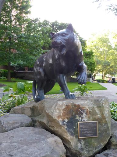 | Keywords: Pitt-Panther.jpg en The plaque on the statue reads<br/> <blockquote>The Pitt Panther<br/> Dedicated August 31 2001 with the belief that scholarship <br/> integrity and the unyielding spirit of our past will carry us<br>into the new millennium and beyond <br/> <br/> A gift from the 1999 Student Body<br/> <br/> George J Mongell<br/> President Student Government<br/> <br/> Mark A Nordenberg<br/> Chancellor</blockquote> de Auf der Tafel steht übersetzt <br/> <blockquote>Der Pitt Panther<br/> Am 31 August 2001 in dem Glauben gewidmet dass Gelehrsamkeit <br/> Integrität und der unbeugsame Geist unserer Vergangenheit uns in das neue Millenium und weiter tragen werden <br/> <br/> Ein Geschenk der Studentenschaft von 1999<br/> <br/> George J Mongell<br/> Präsident der studentischen Vertretung<br/> <br/> Mark A Nordenberg<br/> Chancellor own MartinThoma 2014-06-01 40 26 34 81 N 79 57 16 66 W alt 0_source exif_heading 270 Images by Martin Thoma/CMU Taken with Panasonic Lumix DMC-TZ41 Panthers of Pittsburgh Cc-zero |
