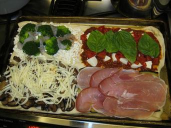 Keywords: pizza food basil prosciutto broccoli mushrooms cheese raw