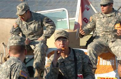 | Keywords: Pizza Party Provided to Taji Troops DVIDS35096.jpg en Batavia N Y -native Staff Sgt Jeffrey Lambert left and Pfc Michael Minch of Clark N J both food service specialists for Company E Echo 2nd Battalion 8th Cavalry Regiment prepare Little Caesars pizzas for the Soldiers of Company B Band dog 2nd Bn 8th Cav Regt in a mobile field kitchen emplaced at the Co B motorpool Jan 18 on Camp Taji Iraq U S Army photo by Sgt Jon Cupp 1st Brigade Combat Team Public Affairs 1st Cavalry Division 2007-01-18 Staff Sgt Jon Cupp https //www dvidshub net/image/35096 35096 2007-01-22 11 57 TAJI IQ PD-USGov 1st Cavalry Division United States Camp Taji Images from DoD uploaded by Fæ |