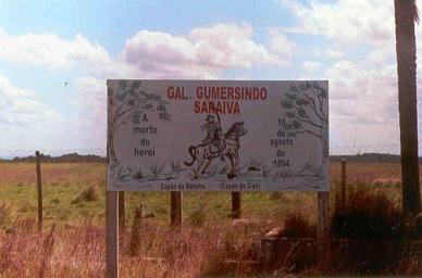 | Keywords: Placa em Homenagem ao Gal. Gumersindo Saraiva - Capão do Cipó - RS.jpg Pt Placas Colocadas no marco do Capão da Batalha para homenagear o líder Maragato Gal Gumersindo Saraiva Uma delas é do município de Capão do Cipó e outra do Partido Nacional Eu mesmo fiz - Fotografia de Cássio Kurtz Bandeira Cássio Kurtz Bandeira Fevereiro de 2009 Federalist revolution in Brazil | ||||