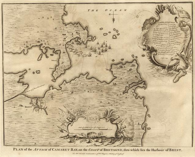 | Keywords: Plan of the Attack of Camaret Bay.jpg  en Plan of the Attack of Camaret Bay on the Coast of Bretagne thro which lies the Harbour of Brest <br />For Mr Tindal's continuation of Mr Rapin's History of England<br />Explanation A The fleet at anchor B Ships appointed to attack the Batteries of the Enemy which are observed by using the Boats of the Cahn C The same ships cannonading the Batteries of the Enemy and favouring the descent D Boats of soldiers for the descent E Rocks on which seven of our ships stranded F Intrenchments of the Enemy defended by Infantry G Battery playing upon the back part of the Intrenchment H Round Tower mounted with cannon I Batteries L Batteries of Mortars M Cavalry posted to observe us N Cavalry that arrived after our retreat O Ships of the Enemy disarmed in the river of Brest fr Plan de l'attaque dans la baie de Camaret sur la côte de la Bretagne où se trouve le port de Brest de Angriffsplan der Bucht von Camaret an der Küste der Bretagne wo den Hafen von Brest liegt es Plan de batalla de la bahía de Camaret en la costa de la Bretaña donde se encuentra el puerto de Brest own property Basire James engraver 1744 PD-old-100 1744 maps Maps of battles of France Bataille de Camaret James Basire |