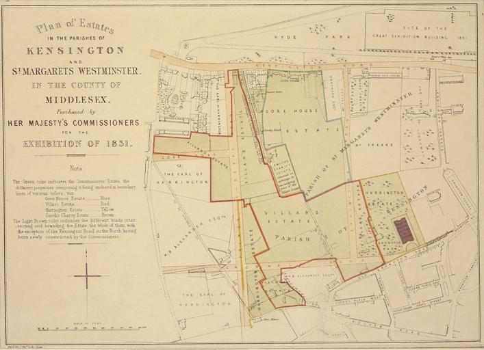 | Keywords: Plan of Estates purchased by Her Majesty's Commissioners for the Exhibition of 1851.jpg Plan of Estates in the Parishes of Kensington and St Margaret's Westminster in the County of Middlesex Purchased by Her Majesty's Commissioners for the Exhibition of 1851 The site in South Kensington depicted in green on this plan was purchased by the Queen's Commissioners to host the Great Exhibition of 1851 The coloured boundaries have the following meanings Blue Gore House Red Villar Yellow Harrington Brown Smith's Charity Estate The site is now occupied mostly by the Natural History Museum the Science Museum Imperial College London and the Royal Albert Hall Media Chromolithograph 229×330mm Lithographer Day Son Scale 1 400 Feet 1 4800 Library number Maps Crace X 15 British Library Online Exhibit http //www bl uk/onlinegallery/onlineex/crace/p/007zzz000000010u00015000 html 1851 Presumably Her Majesty's Commissioners for the Exhibition pd-old Old maps of London The Great Exhibition |