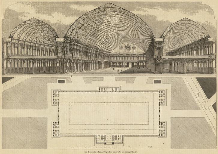 MAKE A MEME View Large Image Plan et coupe du palais de l'Exposition universelle, aux Champs-Elysées.jpg This engraving represents a plan and an elevation of the Palais de l'industrie built for the Great exhibit of 1855 Its façade was made out of thick stone walls ...