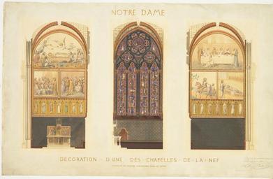 | Keywords: Plan for the Renovation of a Chapel in the Nave of the Cathedral of Notre Dame, Paris.jpg 1843 Watercolor shell gold pen and black ink traces of graphite gouache guidelines sheet 23 5/8 x 37 3/16 in 60 x 94 5 cm Institution Metropolitan Museum of Art object history exhibition history 377640 Signature lower right pen and ink Dressé par les architectes soussignés Paris le 28 Janvier 1843 / Lassus and Viollet le Duc Inscription pen and ink brush and gold paint at top NOTRE DAME; at bottom DECORATION DUNE DES CHAPELLES DE LA NEF / ECHELLE DE QUATRE CENTIMETRES POUR UN METRE credit line accession number 2007 484 PD-100 Architectural drawings of Notre-Dame de Paris Nave of Notre-Dame de Paris Chapels of Notre-Dame de Paris Architectural drawings of Paris Drawings in the Metropolitan Museum of Art 1843 drawings Images of Paris from the Metropolitan Museum of Art |