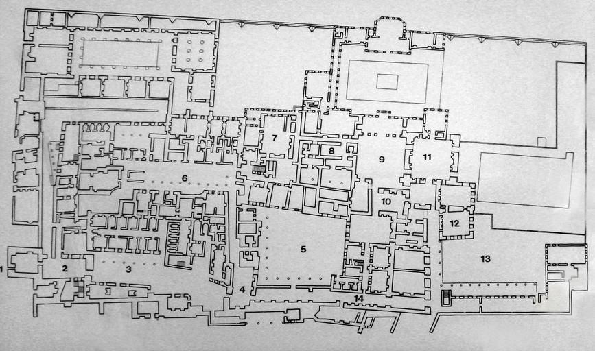 | Keywords: Plan Harem Topkapi Palace Istanbul.JPG Plan Harem Topkapi Palace Istanbul svg Plan of the Harem of Topkapı Palace 1 The Gate of Carriages and the Haremeyn Treasury/The Dome with Cupboards 2 The Sofa with a Fountain - The Tower of Justice - The mosque of Harem Eunuchs 3 The Courtyard and dormitories of the Harem eunuchs - The Chief Harem Eunuch's Quarters and the School of Princes - The Door of the Aviary Harem Exit 4 The main gate of the Harem and sentry post 5 The Courtyard of the Queen Mother - The quarters of the Queen Mother the Sultan's Consorts the princes the senior maid the superintendent and of the servants 6 The Passage and Courtyard of the Concubines - The quarters of the consorts of the Sultan - Dormitories and baths 7 The Queen Mother's Quarters 8 Baths - Bath of the Sultan and of the Queen Mother The Sultan's Private Apartments 9 The Imperial Hall - The apartments of Abdühamid I Selim III and Osman III 10 Hall with a Fountain - the hall with a fireplace 11 Privy Chamber of Murad III - The Privy Chambers of Ahmed I and Ahmed III the Dining Room/Fruit Room 12 The Twin Kiosks the apartments of the crown prince 13 The Terrance and Apartments of the Favourites/Anteroom between men's and women's quarters 14 The Golden Road/Passage Harem Dairesi 1 Araba Kapısı ve Haremeyn Hazinesi/Dolaplı Kubbe 2 Şadirvanlı Sofa - Adalet Kulesi - Harem Ağaları Mescidi 3 Harem Ağaları Taşlığı ve Koğuşu - Dârüsaâde Ağası Dairesi ve Şehzadeler Mektebi - Kuşhane Kapısı 4 Harem Kümle Kapısı ve Nöbet Yeri 5 Vâlide Taşlığı - Vâlide Sultan - Hasseki Sultan ve Şehzadeler - Kalfalar ve Ustalar Daireleri 6 Cariye Koridoru ve Taşlığı - Kadınefendiler Daireleri - Koğuş Hamam 7 Vâlide Sultan Dairesi 8 Hamamlar - Hünkâr ve Vâlide Sultan Hamamları Padişah Dairesi 9 Hünkâr Sofası - I Abdülhamid III Selim ve III Osman Daireleri 10 Çeşmeli Sofa - Ocaklı Sofa 11 III Murad Has Odası - I Ahmed Has Odası - III Ahmed Has Odası Yemiş Odası 12 Çifte Kasırlar Veliahd Dairesi 13 Gözdeler Taşlığı ve Dairesi/Mabeyn Dairesi 14 Altınyol Own 2008-03 Gryffindor self made Plans of Topkapı Palace Harem Topkapı Palace Diagrams labelled with numbers only |