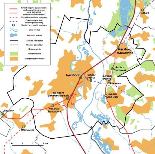 | Keywords: Plan linii kolejowych na terenie Raciborza.png en Plan of railways in Racibórz pl Plan linii kolejowych na terenie Raciborza Odcinki obsługujące ruch osobowy i towarowy zaznaczono linią o kolorze bordowym ruch towarowy linią ciągłą o kolorze czerwonym linią przerywaną o kolorze czerwonym zlikwidowane odcinki a przerywaną linią o kolorze fioletowym zlikwidowane odcinki kolei wąskotorowej Zielone kółka oznaczają stacje i przystanki osobowe przy czym czynne obecnie opisane są większą czcionką <br /><br />Krótkie objaśnienie obecnie do ruchu osobowego w Raciborzu wykorzystywana jest jedynie linia kolejowa nr 151 zaznaczona kolorem bordowym Jest to także jedyna zelektryfikowana i dwutorowa linia przebiegająca przez miasto Na terenie Raciborza odchodzi od niej kilka bocznic do zakładów przemysłowych Kolzam Rafako i SGL Carbon dawniej ZEW jeszcze dawniej Siemens Plania-Werke a także linie kolejowe nr 177 w kierunku zachodnim oraz 176 w kierunku południowym od stacji Racibórz Markowice Od linii 177 odgałęziała się jeszcze zlikwidowana już linia nr 193 do Krzanowic a dawniej do Opawy W pobliżu stacji Racibórz Studzienna pod koniec II wojny światowej znajdowała się także wybudowana pośpiesznie przez Niemców bocznica zlikwidowana po wojnie W Raciborzu znajdowała się także linia kolei wąskotorowej prowadząca m in przez Rudy do Gliwic Kończyła się na stacji Ratibor Plania od której odchodziła jeszcze bocznica do zakładów Siemens Plania-Werke później ZEW obecnie SGL Carbon Istniały także plany przedłużenia linii do stacji Racibórz nie zostały jednak zrealizowane Od linii w okolicy stacji Lucasine odchodziła także bocznica do zakładów Ema-Brzezie W okresie międzywojennym bocznica ta przechodziła przez granicę polsko-niemiecką ponieważ zakłady znajdowały się po po polskiej stronie a reszta linii pozostała w rękach niemieckich po podziale Górnego Śląska po plebiscycie i powstaniach śląskich nie przeszkadzało to jednak w jej funkcjonowaniu Odcinek pomiędzy stacjami Lucasine a Ratibor Plania zlikwidowano przy budowie kanału Ulga Pierwotnie zakładano pociągnięcie toru kolejki mostem na ulicy Rybnickiej jednak planu tego nie zrealizowano i linia kończyła się na stacji Lucasine Plan nie uwzględnia śladów kolejki która funkcjonowała w mieście tuż po wojnie i służyła do szybszego transportu gruzów i cegieł z wyburzanych kamienic <br /><br />Na planie zaznaczono również stacje i przystanki kolejowe Obecnie funkcjonujące tj Racibórz i Racibórz Markowice pisane są większą czcionką Stacja Racibórz Markowice w okresie funkcjonowania kolejki wąskotorowej obsługiwała ruch zarówno normalnotorowy jak i wąskotorowy Stacja Lucasine później także Ratibor Rybniker Str funkcjonująca na linii wąskotorowej została zlikwidowana po II wojnie światowej wraz z likwidacją linii Jej śladem powstała jednak linia normalnotorowa a w miejscu stacji Lucasine utworzono przystanek Brzezie Dębicz W miejscu przystanku Ratibor Stadtwald nie utworzono postoju own plan sporządzony został na podstawie przedwojennych niemieckich map dostępnych pod linkami http //contentdm lib byu edu/cdm4/item_viewer php CISOROOT /GermanyMaps CISOPTR 3206 DMSCALE 1 5625 DMWIDTH 600 DMHEIGHT 600 DMX 0 DMY 0 DMMODE viewer DMTEXT REC 1 DMTHUMB 1 DMROTATE 0 i http //contentdm lib byu edu/cdm4/item_viewer php CISOROOT /GermanyMaps CISOPTR 2479 DMSCALE 1 5625 DMWIDTH 600 DMHEIGHT 600 DMX 0 DMY 0 DMMODE viewer DMTEXT REC 1 DMTHUMB 1 DMROTATE 0 a także map dostępnych w serwisie http //maps google pl/ Google Maps oraz na http //maps geoportal gov pl/webclient/ Geoportalu Olos88 Maps of Racibórz Rail transport maps of Poland |