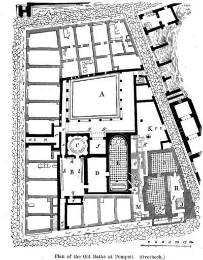 Keywords: Plan of the Old Baths at Pompeii by Overbeck.jpg Plan of the Old Baths at Pompeii Terme del Foro Legend<br> A ” atrium<br> B ” apodyterium room for undressing <br> C ” frigidarium cool bath <br> D ” tepidarium warm room <br> E ” caldarium hot bath <br> F ” thermal chamber<br> G ” women's tepidarium<br> H ” women's apodyterium<br> J ” women's cold bath<br> K ” the servants' atrium<br> M ” chamber for fornacatores persons in charge of the fires a a2 a3 ” entrances to men's baths<br> b ” entrance to women's baths<br> c c2 ” entrances to furnace rooms<br> d ” circular furnace<br> e ” passages<br> f ” probably an oecus or exedra<br> g ” portico<br> h ” walls<br> i ” small room<br> m ” small vestibule<br> q ” passage to the furnace room<br> r ” mouth of the furnace<br> x ” water closet latrina http //www perseus tufts edu/cgi-bin/image lookup 1999 04 0062 fig00190 Harry Thurston Peck Harpers Dictionary of Classical Antiquities 1898 Overbeck PD-old Johannes Overbeck Forum Thermae Pompeii Plans of ancient Roman thermae in Pompeii Forum |