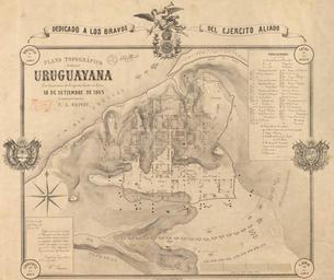 | Keywords: Plano topográfico de la villa Uruguayana con las posiciones de los ejercitos aliados en el dia 18 de Setiembre de 1865 (Cartográfico) — levantado por el ingeniero F. A. Grivot.jpg es Plano topográfico de la villa Uruguayana con las posiciones de los ejercitos aliados en el dia 18 de Setiembre de 1865 Cartográfico / levantado por el ingeniero F A Grivot 1865 GRIVOT Felix Alejandro Plano topográfico de la villa Uruguayana con las posiciones de los ejercitos aliados en el dia 18 de Setiembre de 1865 S l Lit Vigier y Goiran 1865 1 mapa col 36 5 x 45 5 Disponível em <http //objdigital bn br/objdigital2/acervo_digital/div_cartografia/cart219171/cart219171 jpg> Acesso em 6 ago 2016 Felix Alejandro Grivot other versions Custom license marker 2016 08 06 PD-old Cerco de Uruguaiana Maps of the Paraguayan War |