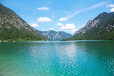 Keywords: plansee austria lake landscape nature water bergsee summer horizontal in the free mountains forest rest europe idyll idyllic still