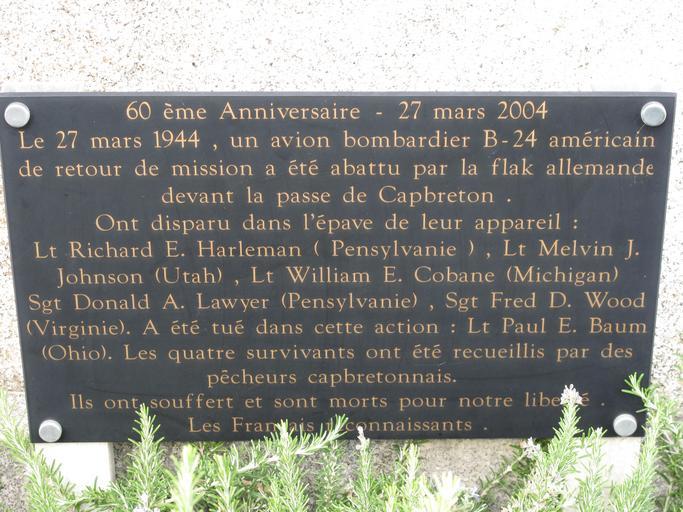 MAKE A MEME View Large Image Plaque B-24 Capbreton.jpg en Plaque in Capbreton Landes France in memory of a US bomber B-24 shot down after a mission over Germany during WWII on march 27 1944 The text is On march 27th-1944 a US bomber B-24 back from a mission was shot ...