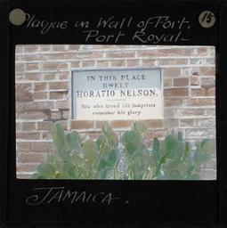 | Keywords: Plaque in Wall of Fort, Port Royal, Jamaica, ca.1875-ca.1940 (imp-cswc-GB-237-CSWC47-LS11-015).jpg en <br> Plaque in Wall of Fort Port Royal Jamaica ca 1875-ca 1940 Photograph of a plaque set into the wall of a fort in Port Royal Jamaica The plaque reads In this place dwelt Horatio Nelson You who tread his footprints remember his glory Port Royal was a city located at the mouth of Kingston Harbour in southern Jamaica It was founded in 1518 and was once home to privateers ; This belongs to a series of Church of Scotland Foreign Missions Committee lantern slides relating to Jamaica In 1800 the Scottish Missionary Society sent three missionaries to Jamaica Two died of yellow fever within weeks of arrival but the third became a pioneer missionary In 1824 a second venture travelled to Jamaica by invitation of local planters to instruct their slaves Scottish missionaries worked at Montego Bay in the 19th century and in 1836 the first presbytery of the Jamaican Church was constituted here Photographer Unknown Filename imp-cswc-GB-237-CSWC47-LS11-015 tif Coverage date circa 1875/1940 Part of collection International Mission Photography Archive ca 1860-ca 1960 Type images Part of subcollection Photographs from the Centre for the Study of World Christianity University of Edinburgh U K ca 1900-ca 1940s Repository name Centre for the Study of World Christianity Archival file impaunpub_Volume7/1790 url Repository address The University of Edinburgh School of Divinity New College Mound Place Edinburgh EH1 2LX United Kingdom Geographic subject country Jamaica Format aacr2 1 lantern slide 8 x 8 cm Geographic subject continent North and Central America Rights Contact the repository for details Part of series Jamaica LS11 Repository email divinity-CSWC ed ac uk Subject lcsh Keyword Memorials; Naval history Date created circa 1875/1940 Publisher of the digital version University of Southern California Libraries Subject aat genre close up views Format aat lantern slides Legacy record ID impa-m69350 Access conditions http //www ed ac uk/schools-departments/divinity/research/centres/world-christianity/collections-resources File GB 237 CSWC47/LS11/15 circa 1875 /1940 author http //digitallibrary usc edu/cdm/ref/collection/p15799coll123/id/64907 PD-old-70-1923 Magic lantern images Images from USC Digital Library uploaded by Fæ International Mission Photography Archive ca 1860-ca 1960 |