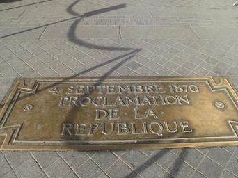 | Keywords: Plaque proclamation de la République.jpg en Plaque in memory of the proclamation of the French Third Republic on 4 september 1870 This plaque is on the ground near the grave of the Unknown Soldier at the Arc de Triomphe de l'Étoile in Paris fr Plaque commémorant la proclamation de la République le 4 septembre 1870 près de la tombe du soldat inconnu à l'Arc de Triomphe de l'Étoile de Paris own Tangopaso 2011-05-16 48 52 25 3 N 2 17 41 92 E region FR_heading SSW Tomb of the Unknown Soldier in Paris Plaques in Paris 8e arrondissement Metal plaques in Paris Plaques referencing 1870 4 September Bronze plaques Proclamation of the French Third Republic 1870 in Paris |