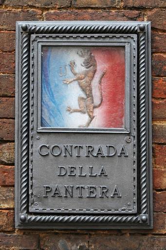 Keywords: Plaque territory Pantera Siena.jpg Plaque marking the territory the contrada della Pantera parish of the Panther piazza del Conte Siena Plaque marquant le territoire de la contrada dell'Aquila paroisse de la Panthère dans la piazza del Conte Sienne own Jastrow 2005 Public Domain Trademarked Palio di Siena Lions passant guardant in heraldry |