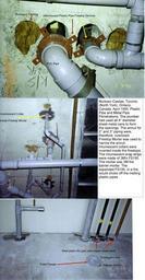 | Keywords: Plastic pipe firestops nortown casitas.jpg Nortown Casitas Toronto North York Ontario Canada April 1995 Plastic Pipe and Metal Pipe Penetrations being firestopped The plumber had used all 4 diameter sheet metal cans to form the openings The annuli for 2 and 3 piping were therefore oversized Firestop Mortar was used to narrow the annuli Intumescent collars were inverted inside the firestops The intumescent wrap strips were made of 3M's FS195 The mortar was 3M Fire Barrier Mortar The expanded FS195 in a fire would choke off the melting plastic pipes Metallic pipes were firestopped with firestop mortar Own 2007-08-21 Achim Hering Plumbing Firestops Firestop mortar Plastics Intumescents 3M Fire Barrier Mortar |