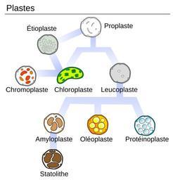 Keywords: Plastids types-fr.svg Plastids are responsible for photosynthesis storage of products like starch and for the synthesis of many classes of molecules such as fatty acids and terpenes which are needed as cellular building blocks and/or for the function of the plant Les plastes sont responsables de la photosynthèse du stockage de substances comme l'amidon et de la synthèse de différentes molécules telles que les acides gras et les terpènes French translation of Image Plastids types svg from LadyofHats Mariana Ruiz Villarreal 2007-10-10 SuperManu Other versions/Plastids types Inkscape Atelier graphique Translation possible LadyofHats Cell diagrams Plastids