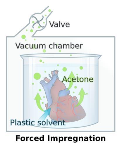 | Keywords: PlastinationProcess EN.svg en The centerpiece of plastination forced impregnation In a vacuum acetone trickles out of the tissue creating a volume deficit in the specimen which allows it to be permeated by the plastic de Der Kern der Plastination die forcierte ImprÀgnierung Hierbei wird das PrÀparat in einer Kunststofflösung unter Vakuum gesetzt Durch den hohen Dampfdruck fÀngt das Aceton an zu sieden und perlt aus dem PrÀparat heraus Dadurch entsteht ein Volumendefizit und das gleiche Volumen an Kunststoff wird ins Gewebe hinein gesaugt Das PrÀparat ist danach vollkommen mit Kunststoff durchtrÀnkt und wird eventuell in die anatomisch richtige Stellung gebracht Englische Version Own DooFi 2009 <gallery>File PlastinationProcess_DE svg German Version</gallery> Anatomical preservation SVG diagrams in English SVG anatomy Gunther von Hagens Vacuum |