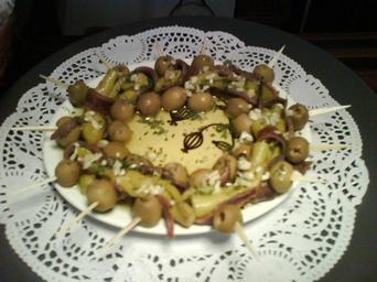 Keywords: Plato de gildas.JPG es Plato de pinchos de gildas own Txo 2008-06 June 2008 in Spain Pinchos Olive-based food Anchovy dishes of Spain Anchovies fillets in oil