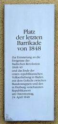 Keywords: Platz der letzten Barrikade.JPG Square of the last barricade during the 1848 Revolution near the Schwabentor Source self-made Date 18 01 2008 Author Manfredjohannes 2007-04-02 own assumed Manfredjohannes 47 59 34 44 N 7 51 14 52 E scale 781_type landmark_region DE History of Freiburg im Breisgau 1848