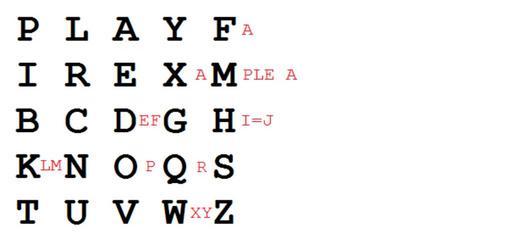 Keywords: Playfair Cipher building grid omitted letters.png SVG en Playfair Cipher Building a cipher table with the code phrase cipher own Davidtheterp 2010-07-06 cipher cc-zero 5x5 arrays