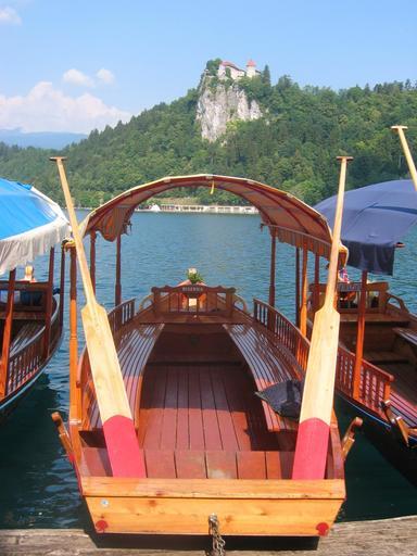 Keywords: Pletna-Bled.JPG Boat called pletna at Bled lake Slovenia photo Ziga 08 35 13 August 2006 UTC Views of Bled Castle with Lake Bled in the foreground Pletnas Oars Decks watercraft Wooden benches in Slovenia 2006-08-13 own assumed Žiga 24
