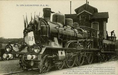 | Keywords: PLM 230 2691-2700.jpg en Presidential train leaded by PLM 4-6-0 2700 in 1909 fr Locomotive compound PLM 230 2700 en tête d'un train présidentiel en 1909 2012-10-03 postcard Fernand Fleury 1918-07-18 Custom license marker 2012 10 05 PD-old-80 Uploaded with UploadWizard Postcards of steam locomotives in France Steam locomotives of the Compagnie des chemins de fer de Paris à Lyon et à la Méditerranée Photographs by Fernand Fleury | ||||