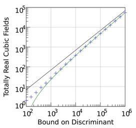 | Keywords: PlotDiscriminantsOfRealCubicFields.svg validSVG Created with Gnuplot en Plot of the number of real cubic fields of bounded discriminant up to 10<sup>6</sup> and the asymptotic distribution Black line is the first order term of the asymptotic green line includes the second order term and blue crosses are the exact counts Data by Michel Olivier available at http //pari math u-bordeaux fr/pub/pari/packages/nftables/ Asymptotics from Bhargava “Shankar “Tsimerman On the Davenport “Heilbronn theorem and second order terms http //arxiv org/abs/1005 0672 arXiv 1005 0672 own RobHar 2010-06-06 Data file This image was created using gnuplot 4 2 4 with the following command file It was subsequently edited with Inkscape and a text editor to fix display problems wikipedia has set terminal svg enhanced fname Helvetica fsize 20 set output cubicreal svg Axes set size square make the graph square set logscale loglog plot set xrange 100 1000000 adjust axis range set yrange 1 200000 set xlabel Bound on Discriminant set ylabel Totally Real Cubic Fields set xlabel 0 0 0 5 adjust positioning of axis label set ylabel -2 1 0 0 tics set format 10 m L adjust format of tic labels set xtics offset 1 0 0 45 nomirror adjust placement of tic labels and nomirror tics set ytics offset 3 0 0 0 nomirror set mxtics 10 set number of minor tics set mytics 10 set grid xtics ytics lt rgb gray lw 1 set grid set style line 1 lt 3 pt 1 ps 0 9 set marker style to blue cross adjust size set style line 2 lt -1 lw 1 set marker style to black line set style line 3 lt 2 lw 1 set marker style to green thick line f x 0 069325614381725 x - 0 147685261030334 x 0 83333333333333333 g x 0 069325614381725 x plot cubicrealdata index 0 using 1 2 notitle with points linestyle 1 \ f x notitle with lines linestyle 3 \ g x notitle with lines linestyle 2 Number theory SVG diagrams Images with Gnuplot source code |