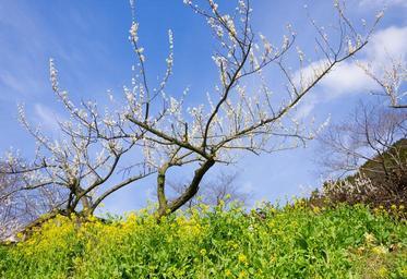 Keywords: plum spring pink white plum rape blossoms sky