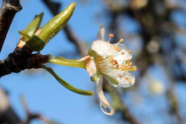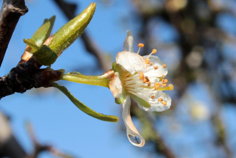 Keywords: plum tree prunus domestica plum blossom flowering stems branches spring leaves buds raindrop wet mirroring nature