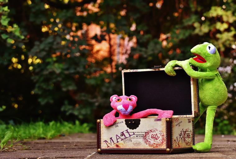 Keywords: plush toys kermit the pink panther toys box chest suitcase fun funny play stuffed animal children fun fig plush frog panther travel go away holiday