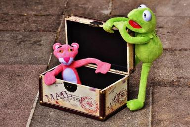 Keywords: plush toys kermit the pink panther toys box chest suitcase fun funny play stuffed animal children fun fig plush frog panther travel go away holiday