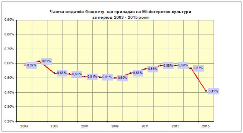 Keywords: Бюджет Мінкульту.png uk Частка видатків Де жавного бюджету Ук аїни що п ипадає на іністе ство культу и Ук аїни Динаміка за пе іод 2003 -2015 оки 2015-11-27 own A1 other versions cc-zero Culture of Ukraine Finance diagrams Uploaded with UploadWizard |