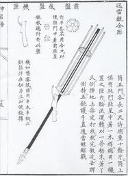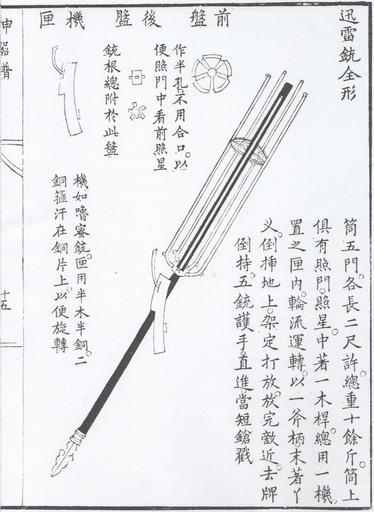 Keywords: 迅雷銃全形.png en Ming dynasty 5-barreled firearm with a flamethrower and a spear head on center shaft 迅雷銃 mean fast-thunder gun zh 神器 第十五頁右半迅雷銃全形 神器 趙士楨 1598-MM-DD PD-old-100 Firearms in art Early firearms Multiple barrel firearms