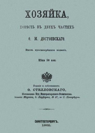 | Keywords: Хозяйка (повесть).png pt-br Frontispício da edição revista pelo autor da obra A Senhoria de Dostoievski ru Хозяйка Повесть в двух частях Сочинение Ф Достоевского Вновь п осмот енное самим авто ом издание Издание и собственность Ф Стелловского СПб Тип Ф Стелловского 1865 106 с 2014-10-11 06 28 27 http //www fedordostoevsky ru/works/lifetime/housewife/1865/ Fyodor Dostoyevsky other versions PD-old-70-1923 Uploaded with UploadWizard Books by Fyodor Dostoyevsky | ||||