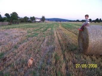 Keywords: Po žních1.JPG cs Čas po žních - sklizená úroda na polích u Kunemile own Myšistar 2008-08-27 Kunemil Children of the Czech Republic Sitting children Round straw bales