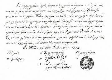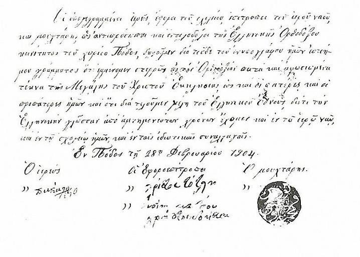 Keywords: Pod Greek Municipality Letter.jpg Писмо от г ъцката община в село Под A letter from the Greek municipality in the village of Pod today Flamouria Greece The signed below priests regents of the school board holy church wardens and the official president of the community as representatives and proxies of the Greek Orthodox Community of village Podos state with this signed by us official letter that we stay hardily in Orthodoxy faithful and staunch children of the Holy Christ's Church as our fathers and our forefathers and that we remain members of the Greek Nation because we carry Greek language from immemorial times to our holy church to our school and to our private transactions In Podos 28th February 1904 the Priest the Teacher Regents and Church Wardens Spiros Totlis the President http //macedonia-documents-and-proofs blogspot com/2009/02/blog-post_11 html 1904-02-18 Pod Greek municipality PD-old History of Greece 18 February 1904 documents 1904 in Greece |