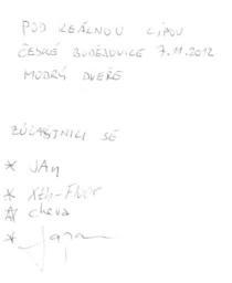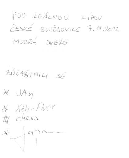 Keywords: Pod reálnou lípou ČB 2012-11-07.jpg cs Prezenční listina ze setkání v restauraci Modrý dveře 2012-11-07 own JAn Dudík 48 9736669 14 4735464 cc-zero Uploaded with UploadWizard Wikimedia meetups