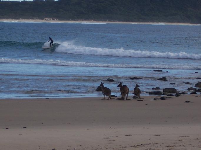 Keywords: Point Plomer Kangaroos.jpg Port Macquarie New South Wales with a surfer in the background Own Ben Tillman 2007-07-30 Unidentified Macropus Surfing in Australia Beaches of New South Wales Port Macquarie