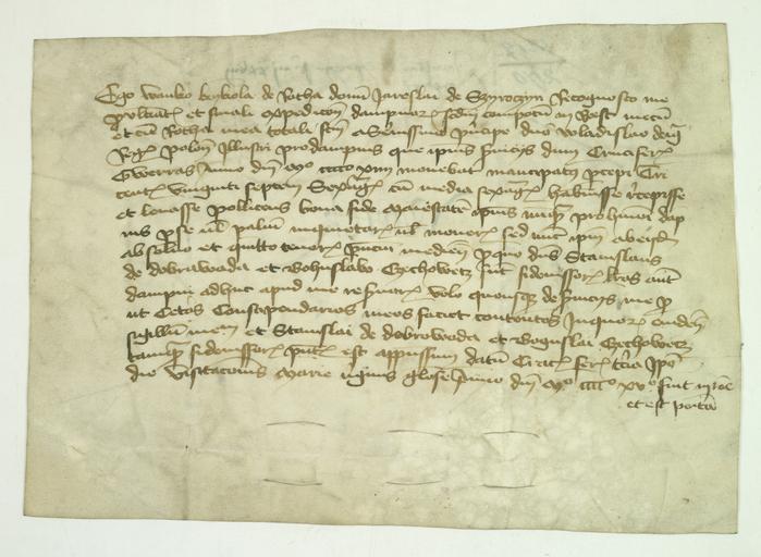 | Keywords: Pokwitowanie odbioru zaplaty za sluzbe w wojnie.jpg Artwork pl Wańko Kykola z roty Jarosława z Żerotina de Szyroczin kwituje odbiór zapłaty za służbę w wojnie 1414 r przeciw zakonowi krzyżackiemu 1892-07-12 parchment 20 3 x 12 2 + 2 cm Institution Archiwum Główne Akt Dawnych nacięcia po 3 paskach od pieczęci; Dawne sygn 1219/270; Vaniek; Variorum No 13; nichil; 1/6; 81; 606; W 10 Miejsce powstania Kraków Język dokumentu łac Druk/rękopis rękopis Forma oryginał Wydanie drukiem K Marcinkowski Materyały do historyi wojen z krzyżakami spis sum wypłaconych wojskom zaciężnym Roczniki Towarzystwa Naukowego w Toruniu R 13 Toruń 1906 s 243 AGAD Zbiór Dokumentów Pergaminowych nr 1221 AGAD partnership PD-old-100 Documents from Archiwum Główne Akt Dawnych Zbiór Dokumentów Pergaminowych w Archiwum Główne Akt Dawnych |