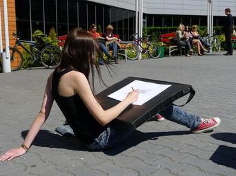 Keywords: poland woman girl female drawing sketch artist outside people plaza summer spring