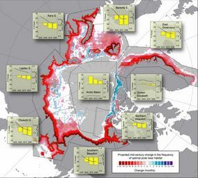 | Keywords: Polar Bear Habitat.png Projected changes based on 10 IPCC AR-4 GCM models run with the SRES- A1B forcing scenario in the spatial distribution and integrated annual area of optimal polar bear habitat Base map shows the cumulative number of months per decade where optimal polar bear habitat was either lost red or gained blue from 2001 “2010 to 2041 “2050 Offshore gray shading denotes areas where optimal habitat was absent in both periods Insets show the average annual 12 months cumulative area of optimal habitat right y-axis line plot for four 10-year periods in the 21st century x-axis midpoints and their associated percent change in area left y axis histograms relative to the first decade 2001 “2010 http //www usgs gov/newsroom/special/polar_bears/docs/USGS_PolarBear_Durner_Habitat_highres pdf Predicting The Future Distribution of Polar Bear Habitat in the Polar Basin from Resource Selection Functions Applied to 21<sup>st</sup> Century General Circulation Model Projections of Sea Ice USGS PD-USGov Global warming maps Maps of the Arctic Ocean Sea ice Ursus maritimus distribution maps |