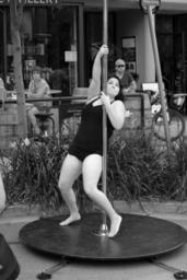 Keywords: blackandwhite black white bw monochrome street streetphotography downtown canada britishcolumbia bc okanagan kelowna poledancing blockparty summer woman female person outdoors