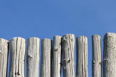 Keywords: poles wood fence worn faded sun-bleached blue sky natural bleached
