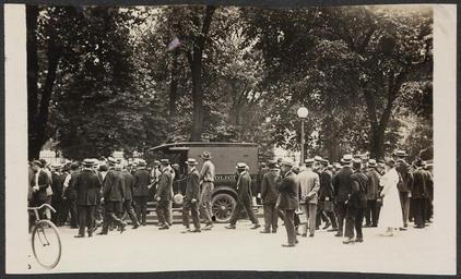 | Keywords: Police arrest pickets 160041v.jpg Summary Photograph of crowds of people outside around a police wagon Police arrest pickets August 1917 Harris Ewing Washington D C Photographer 1917 Title derived by Library of Congress staff 1 photograph print; 4 25 x 7 in accession number Call Number Location National Woman's Party Records Group I Container I 160 Folder Pickets--Arrests and Imprisonment Source Collection Records of the National Woman's Party institution Library of Congress Manuscript Division http //hdl loc gov/loc mss/mnwp 160041 PD-1923 PD-Harris-Ewing suffragettes August 1917 in Washington D C |