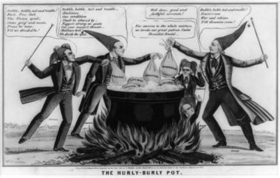 | Keywords: Politicalcartoon1850unrestored.jpg The artist attacks abolitionist Free Soil and other sectionalist interests of 1850 as dangers to the Union He singles out for indictment radical abolitionist William Lloyd Garrison Pennsylvania Free Soil advocate David Wilmot New York journalist Horace Greeley and Southern states' rights spokesman Senator John C Calhoun The three wear fool's caps and gather like the witches in Shakespeare's Macbeth round a large boiling cauldron adding to it sacks marked Free Soil Abolition and Fourierism added by Greeley a vocal exponent of the doctrines of utopian socialist Charles Fourier Sacks of Treason Anti-Rent and Blue Laws already simmer in the pot Wilmot Bubble bubble toil and trouble / Boil Free Soil / Ther Union spoil; / Come grief and moan / Peace be none / Til we divided be Garrison Bubble bubble toil and trouble / Abolition / Our condition / Shall be altered by / Niggars strong as goats / Cut your master's throats / Abolition boil / We divide the spoil Greeley Bubble buble sic toil and trouble / Fourierism / War and schism / Till disunion come In the background stands the aging John Calhoun He announces For success to the whole mixture we invoke our great patron Saint Benedict Arnold Benedict Arnold rises from the fire under the pot commending them Well done good and faithful servants lithograph with watercolor on wove paper ; 27 x 39 2 cm image Library of Congress CALL NUMBER PC/US - 1850 B157 no 42 B size P P 1850 James S Baillie PD-old Doctrines Fourierism Jesters in engravings Treason Fool's caps Dunce caps Free Soil Party |